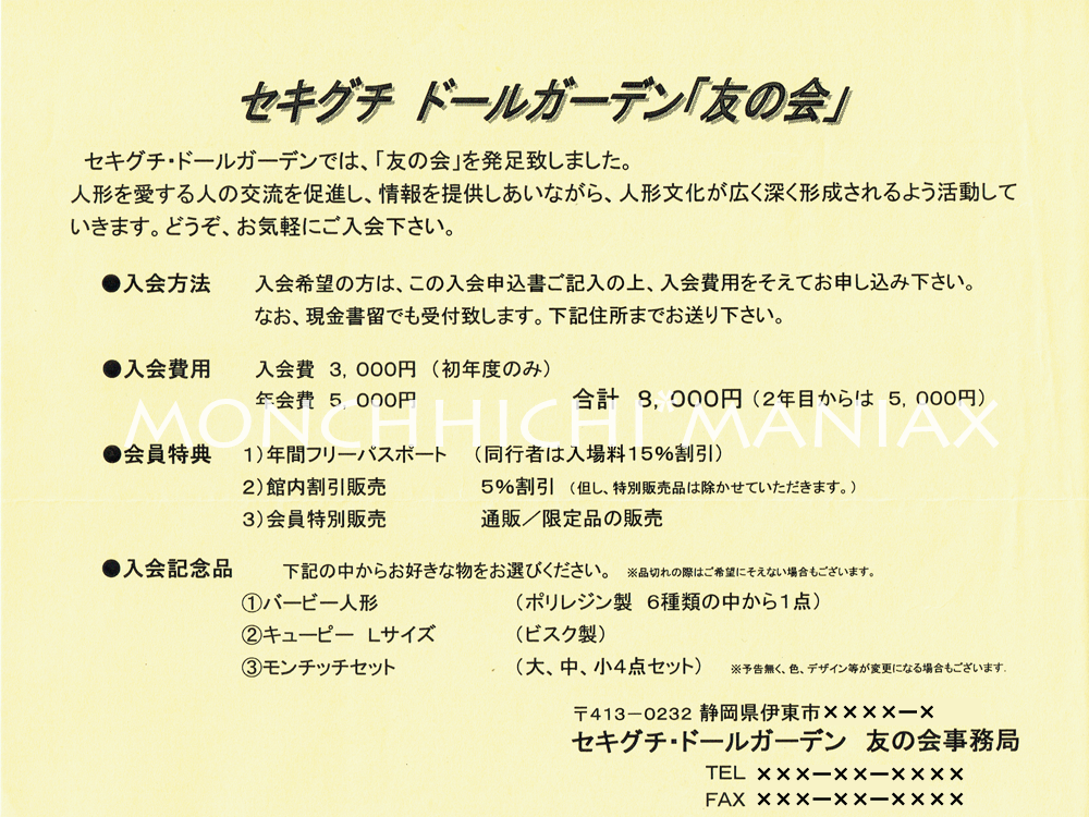 元々は「セキグチドールガーデン友の会」という名称で、モンチッチだけではなく人形全般を対象としたファンクラブでした。